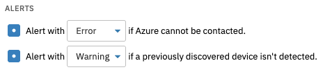 Set the level of alert you want to receive if the event monitor cannot contact Azure. Below this, choose the level of alert you want to receive if a previously discovered device isn't detected.