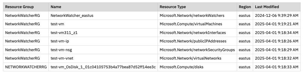 The other major benefit of adding an Azure Resources Event Monitor to your FrameFlow config is that you can include a table of resources in the event monitor's output. This means that when the event monitor runs on your designated schedule, it'll generate an updated table of resources complete with columns for name, resource type, region, and last modified date.