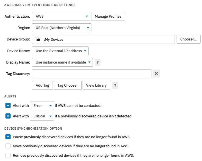 The Amazon AWS Discovery Event Monitor works similarly to the Ping Discovery Event Monitor. It auto-discovers Amazon EC2 instances in your AWS account and adds them to your monitoring configuration. Add the access key ID and secret access key alongside the other information fields you see below, then fill in the alert options that the event monitor provides. This event monitor, like all of the proceeding ones, also has the options to pause, move, and remove devices that have previously been detected.