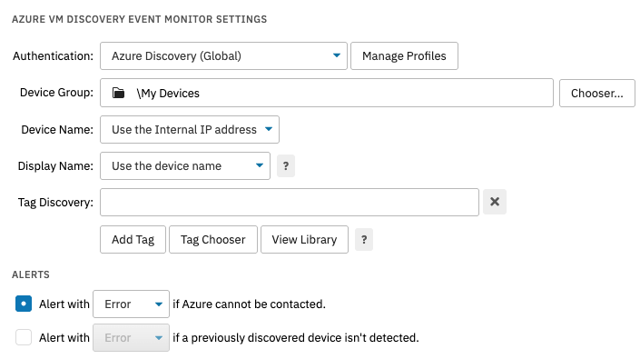 For the Azure VM Discovery Event Monitor, you'll need to add the credentials to your Azure account or choose an authentication profile with the necessary credentials. After that, just select the device group that detected devices will be added to. You can choose to pause, move, or remove devices that have previously been discovered by the event monitor to prevent clutter.