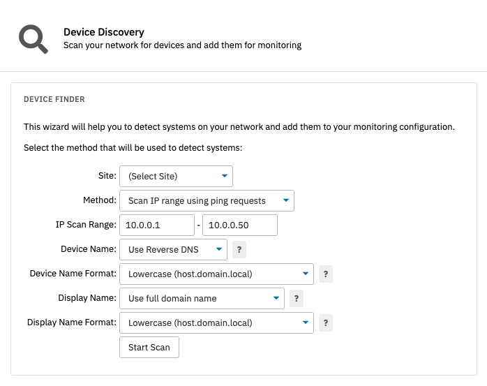 In FrameFlow's Tools section, you'll find a feature called device discovery. Device discovery is especially useful early into your FrameFlow setup process. This tool can scan for devices using ping requests, SNMP, or Active Directory. All you have to do is enter the range of IPs the tool should scan (for the ping and SNMP options) or the domain controller, username, and password (for the AD option). After that, you can customize the name format and display name type that new devices will display within FrameFlow.