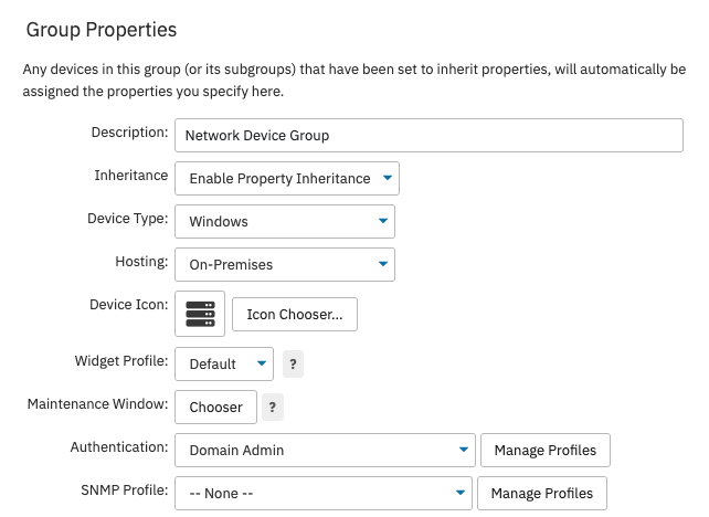 Right-click on your new device group and select "Properties". This is where you configure the settings that devices with device property inheritance enabled will pick up when added to the group. Property inheritance for groups is off by default, but you can toggle it on in this window. After that, you can change things like device icon, type, widget profile, tags, and much more. You can learn more about group properties and property inheritance with this device property inheritance article.