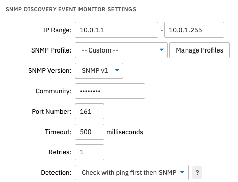 FrameFlow's SNMP Discovery Event Monitor uses SNMP to add new devices. Just add an IP range and an SNMP profile, which defines a set of parameters for connecting devices to an SNMP manager. As with all discovery event monitors in FrameFlow, you can choose a device group to add discovered devices to, ensuring that they pick up the settings you've configured for devices in that group.