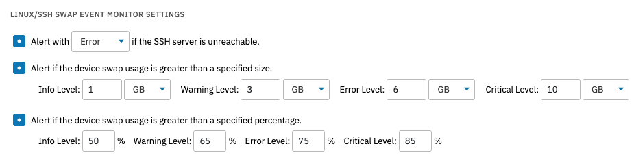 The Linux/SSH Swap Event Monitor has dedicated alerting options for swap usage size and percentage, which lets you choose how to measure this metric. Use the option to alert on swap usage size to enter specific sizes in your preferred unit of data. Use the percentage option to measure swap usage size in terms of percentage. You can also use both of these options to receive alerts based on both metrics.
