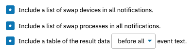 Each time your SSH Swap Event Monitor runs, it generates data you can find in the Status tab of your event monitor. There are several options that let you include additional information in the event monitor's output. First, you can include a list of all detected swap devices in the event monitor's notifications. The same option exists for swap processes. As with our other Linux-focused monitors, you can also include a table of result data in the event monitor output. These options can help you record and track swap data over time.