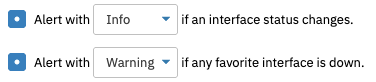 You can choose to be alerted about any interface status change with the first option. The second option willl alert you if the event monitor detects that any interface is down. This event monitor also generates a data point that you can use to populate reports and graphs on the FrameFlow interface. The "Status" data point will return a value of 1 if the interface status is up and 0 if it's down.