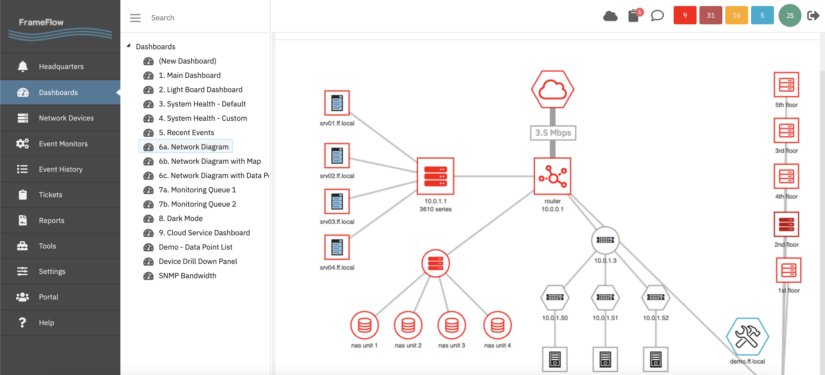 To keep on top of enterprise monitoring status, you need views of the network that match the topology. That's why FrameFlow makes it easy to build rich network diagrams that not only reflect your true topology but also show the statuses of services and equipment.